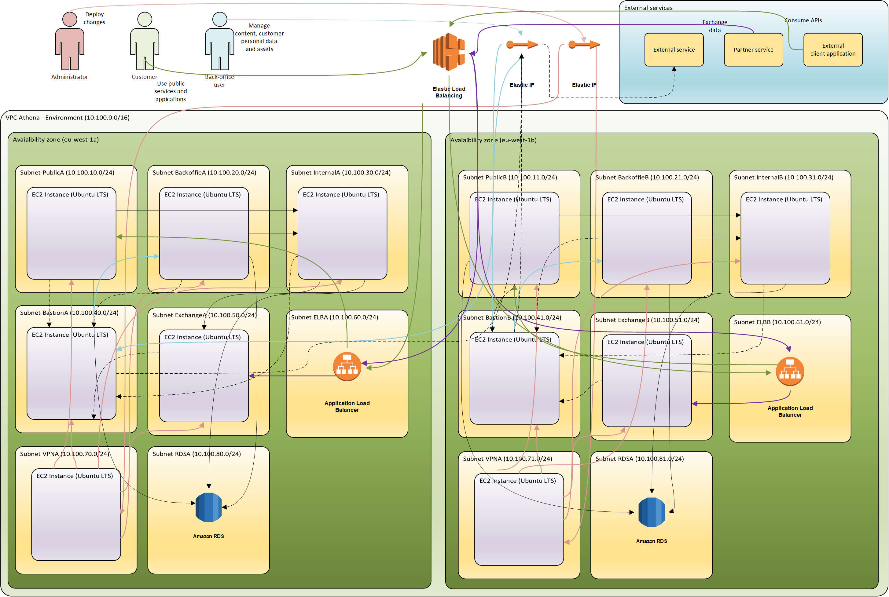 Personal Data protection- deployed services and applications store data on encrypted data volume.Secure communications- communication with deployed services by default are encrypted using SSL (2048 bit keys) and use SSL Authentication. Network Firewall rules are enabled to make sure that users can access deployed web applications only throughWeb Application Firewall.Recovery- athena infrastructure is built and maintained as a code and is part of the same change, release and build process as solution service and application code. Infrastructure is destroyed and rebuilt as part of continuous integration regression testing and thus is always recoverable from the scratch in very short period of timeResiliency- services are deployed in a resilient configuration and are accessible through load balancersDisaster recovery- athena infrastructure is built for automatic disaster recovery with AWS multi zone (multiple data centers) design as a primary implementation. Disaster recovery environment is always available and participates in handling of incoming user requests. Should one data center become unavailable, all traffic is automatically routed to available data center. Should both data centers become unavailable it is possible to rapidly recover infrastructure and services an restore service data from backups thanks toAutomated deployment.Scalability- athena infrastructure scales automatically depending on a system load, with AWS Autoscaling groups being as primary implementation for auto-scaling.