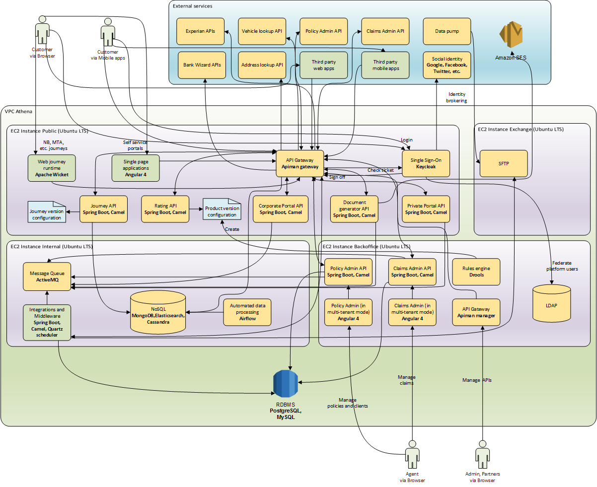 Web journeys- Apache Wicket is server-side components based web application framework that allows to build responsive/AJAX rich web applications with easy fallback to non-AJAX behaviorIntegrations and middle-ware- Spring Boot micro-services using Apache Camel (EIP) and Quartz scheduler allows to build software patterns and best practices enabled highly maintainable and robust middlewareSingle page application framework- Angular 4 is very well documented and mature single page application framework backed by major vendor that allows to build highly maintainable (TypeScript provides “compile time” validation and good refactoring capabilities) modern web applications with highly interactive User experienceApplication framework- Spring Framework has it all. No need to build your own framework or re-invent abstractions to avoid technology lock-ins.Data access framework- Spring Data provides patterns and implementations for data access layer abstractionMVC framework- Spring MVC is tool of choice if there is use case to build simple MVC applicationMicro-services- Spring Boot using Apache Camel (EIP) allows to build software patterns and best practices enabled highly maintainable and robust micro servicesMessage Queue- Apache ActiveMQ is robust and easy to maintain classic message queue that enables use of (EIP) and provides resiliency and asynchronous processingRDBMS- PostgreSQL and MySQL are reliable, highly performant and proven two most popular and best open source DBs.NoSQL DB- MongoDB, Elasticsearch and Cassandra are stable and well supported three most popular NoSQL storage solutions that cover three different NoSQL use casesRelease process, dependency and source code management- Apache Maven, Git Flow and JGit Flow are battle tested, easy to use, well supported and well known tools/processes/frameworks known by most developersETL and data processing tools- Airflow is easy to use tool to create and maintain complicated automated Workflows to crunch through enormous quantities of data and apply complicated workflows to group, segregate and link data so that it can be used for decision makingRules engine and business logic- Drools is free to use rule engine that, if used properly, can be used to build maintainable highly performant underwriting, pricing and rating modelsAPI gateway- Apiman is enterprise level, easy to extend API Gateway which allows to organize micro-service deployment and accelerate API build by taking over and enabling out of the box common API aspects such as authentication, authorization, whitelisting, blacklisting, usage reporting and limiting, etc.Single Sign-On- Keycloak is standards based single sign on/off identity provider with very rich and diverse integration capabilities. Provides single sign on/off capabilities for all deployed micro-services to facilitate seamless and easy end-user experienceFile exchange- OpenSSH (SFTP) server is battle proven, secure and extremely performat file exchange server