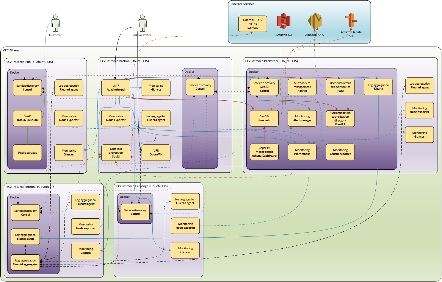 Monitoring- Glances and Prometheus are used to collect, analyze and display server and service stats as well as to send alerts when certain thresholds of service or server resource availability are exceededLog aggregation- Fluentd, Elasticsearch and Kibana are used to collect all system and service logs in one place to provide easy and extremely insightful audit and troubleshooting capabilitiesIdentity management and LDAP provider- Free IPA provides platform user directory used to authenticate and authorize users before they can access certain platform servicesBackup/Restore- AWS S3 provides highly reliable and cheap off-site backup capabilitiesPublic DNS- AWS Route53 is easy to use public DNS provider with rich automation API that allows easy and straightforward access to deployed services using DevOps automationSMTP server- AWS SES is battle tested and cheap SMTP service with proper SPAM and Bounce handling proceduresData loss protection- Squid and Apiman are used to whitelist which external services can be accessed by deployed Athena servicesService discovery and KV store- Consul provides deployed Athena service discovery and registry capabilities as well as Key/value storage for deployed environment stateCluster and capacity management- Athena Dashboard is easy to use Web UI for DevOPs to view environment state (list of platform users, their state, service versions installed, resource usage and status), do capacity planning and perform common DevOPs functions such as starting/stopping of servers and services, redeployment or inception of services, adding/removing capacity, backing/recovery of service data, etc.User self service portal- PWM is used for new platform user on-boarding and user self service, such as resetting forgotten password, etc.Microservice management- Hawtio allows to debug and trace as well as to collects runtime information and stats from all micro-services built using Apache CamelWAF (Web Application Firewall)- NAXSI, Apache httpd and Fail2Ban are simple yet powerful tools to prevent intrusion into publicly deployed services and allows to restrict features exposed by these servicesVPN- OpenVPN server is used to give privileged access internal network of deployed environmentHID (Host Intrusion Detection)- OSSEC monitors all Host processes and critical files to detect any unauthorized changes to critical resourcesDevOPs- Rundeck is used to give DevOPs members fine grained access to environment management features as well as to enable deployment automation solutions (for example: Jenkins installing new version of release in Development environment as part of build pipeline).